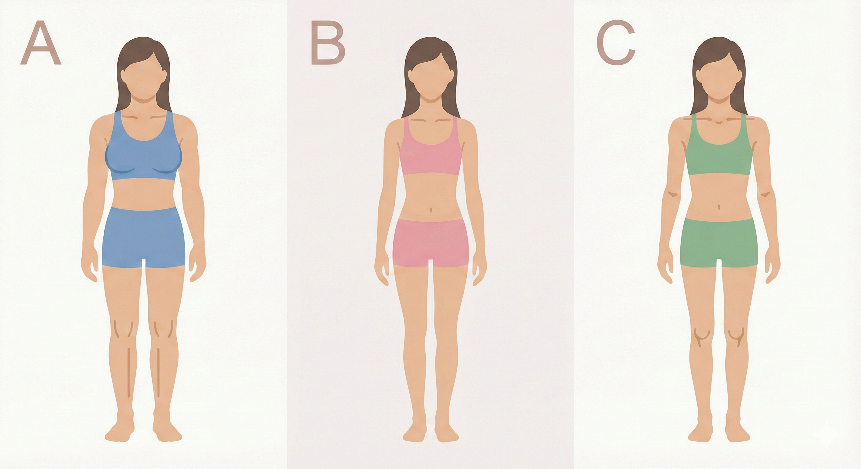 バストや腰位置が高く、上半身にボリュームがある「上重心」。